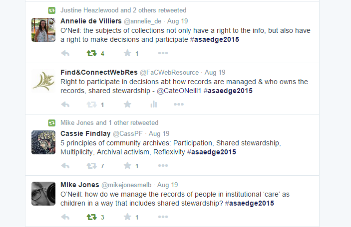 Another significant presentation at the ASA conference was given by Kim Eberhard, who presented on ‘Records, recordkeeping and Commissions of Inquiry: emerging trends and on-going issues’. Kim discussed the evolution of record keeping issues over the course of 80 inquiries related to child welfare in Australia. She mentioned the Find & Connect web resource as one of the few recommendations coming out of the inquiries to have been actioned successfully.
