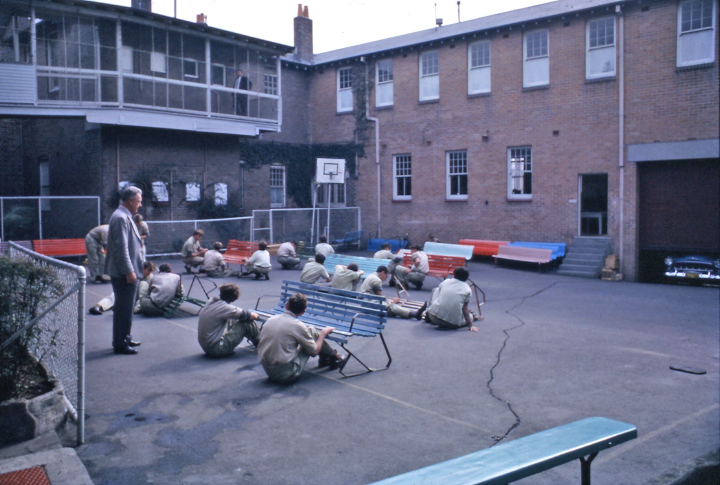 This is a photograph of boys making benches at the Metropolitan Boys’ Shelter. It shows approximately 17 teenage boys sitting in a courtyard finishing the construction of benches. There is a staff member watching them. The courtyard is surrounded on at least two sides by a two-storey brick building. This photograph is part of a…