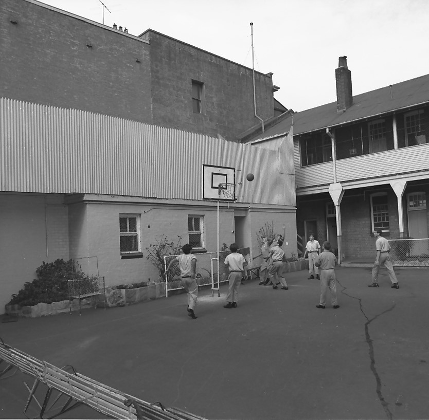 This is a photograph of boys playing basketball at the Metropolitan Boys’ Shelter. I tshows eight boys playing basketball in a courtyard surrounded one two sides by multiple phases of brick buildings. This photograph is part of a collection of photographs from children’s Homes and Institutions held by the NSW Department of Community Justice.