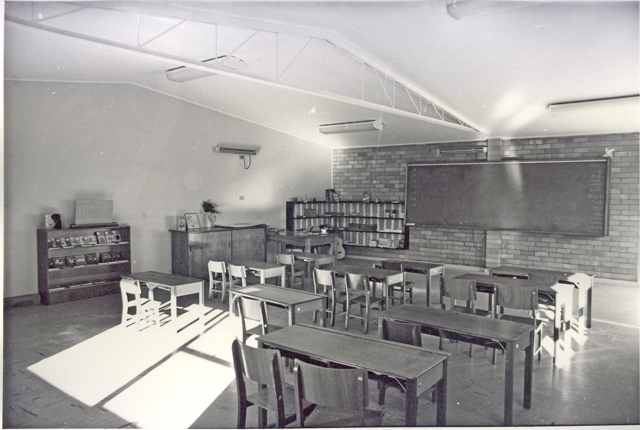 This is a photograph of a classroom at Karril Cottage. It shows an empty classroom with desks for about 20 students. There is a chalkboard at the front of the room with a list of spelling words down the side. Against the wall are a teachers desk, a cabinet, shelves holding a small number of…