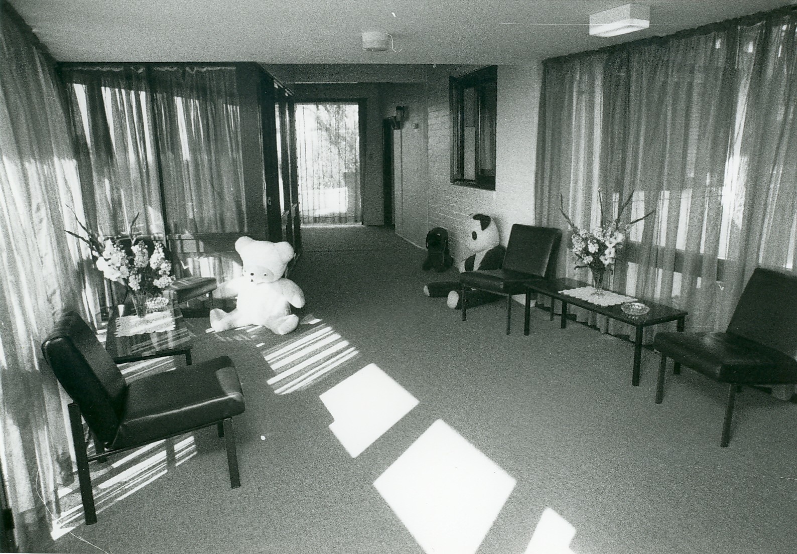 This is a photograph of the entrance room at Raith Lark Hill Hostel. It shows a room with a side table, two chairs, largeĀ and an oversized teddy-bear on each side. This photograph is part of a collection of photographs from children’s Homes and Institutions held by the NSW Department of Community Justice.