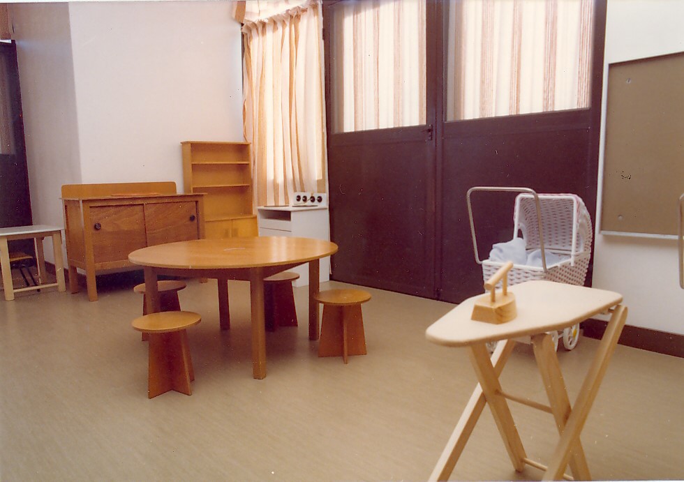 This is a photograph of the infant’s playroom at Raith Lark Hill Hostel. It shows a room with a low table and stools, a toy kitchen including sink and stove, a small pram, and a toy ironing board and iron. This photograph is part of a collection of photographs from children’s Homes and Institutions held…