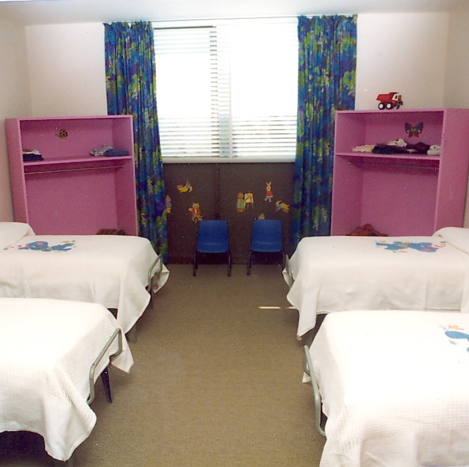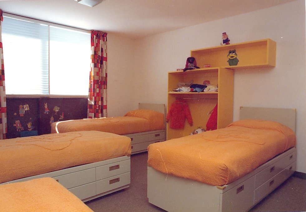 This is a photograph of a children’s dormitory at Raith Lark Hill Hostel. It shows a room with four beds with orange sheets placed close together. Each bed has some drawers underneath it, and there is a small orange wardrobe and shelf on one wall. The room has been decorated with pictures of animal characters….