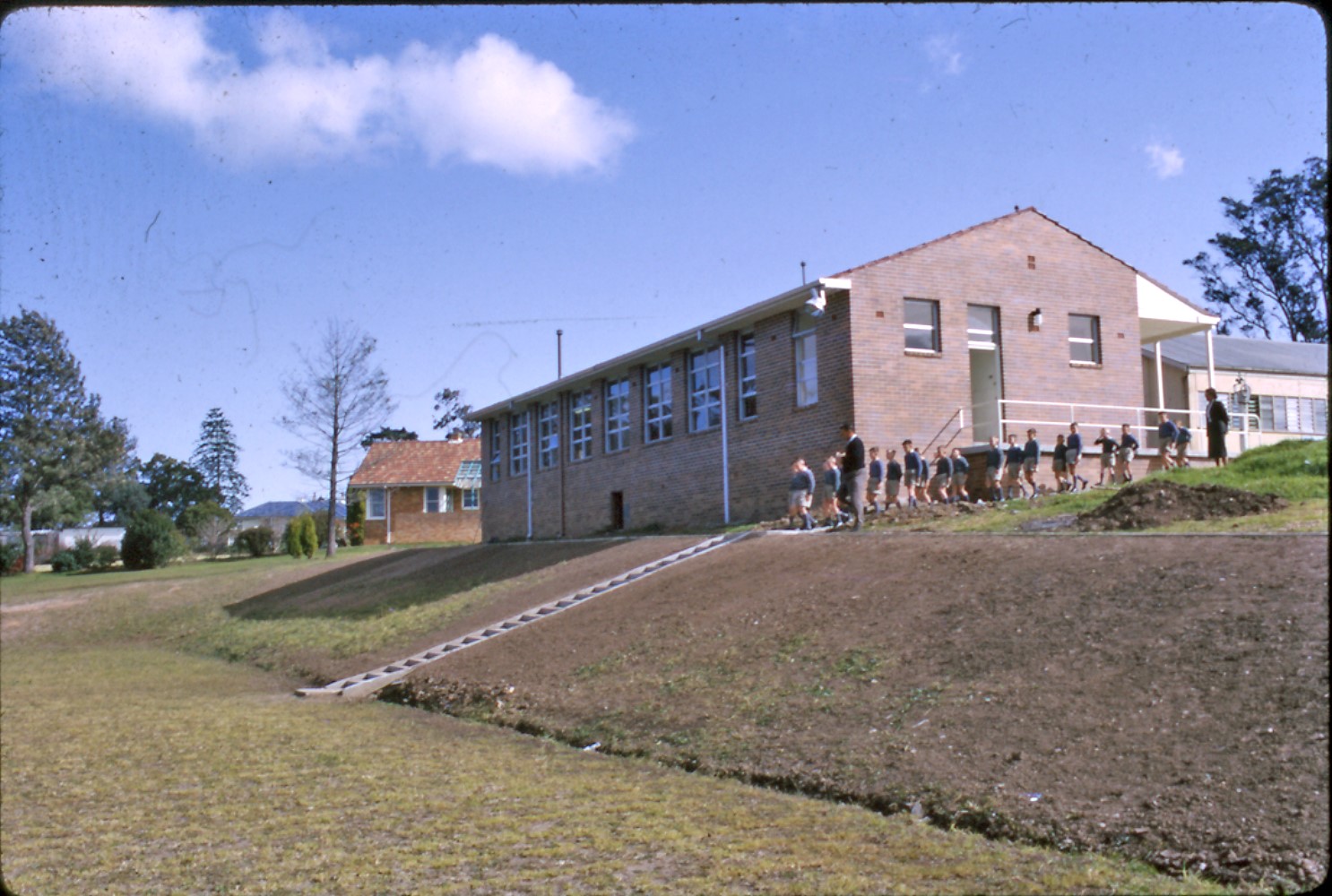 This is a photograph showing a group of boys and adults walking down steps to the May Villa playground. Another similar photograph appeared in the Child Welfare Department of New South Wales Annual Report of 1964, with the caption “Boys coming out to play at May Villa, with the new school building in the background”….