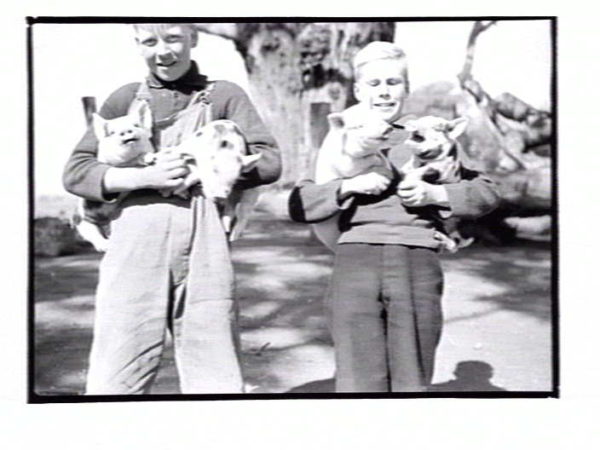 This photograph was taken at Northcote Training Farm school, Glenmore, Victoria. It shows two boys (presumably residents of the training farm) each holding two piglets.