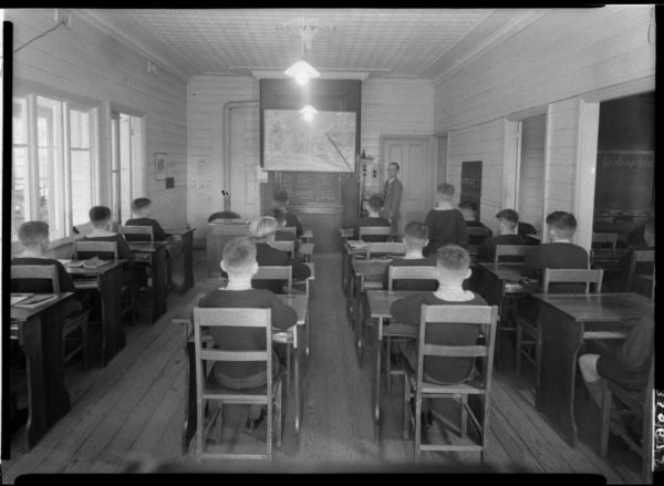 This is a photograph of boys in a classroom at Weroona Home. It shows 16 boys seated at desks in a classroom, facing a teacher pointing to the board at the front of the room. Another classroom can be seen through a doorway to the right of the photograph.
